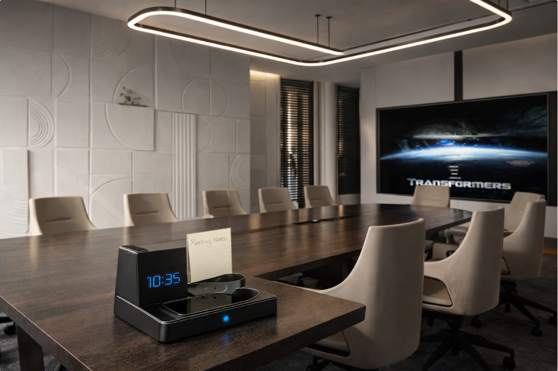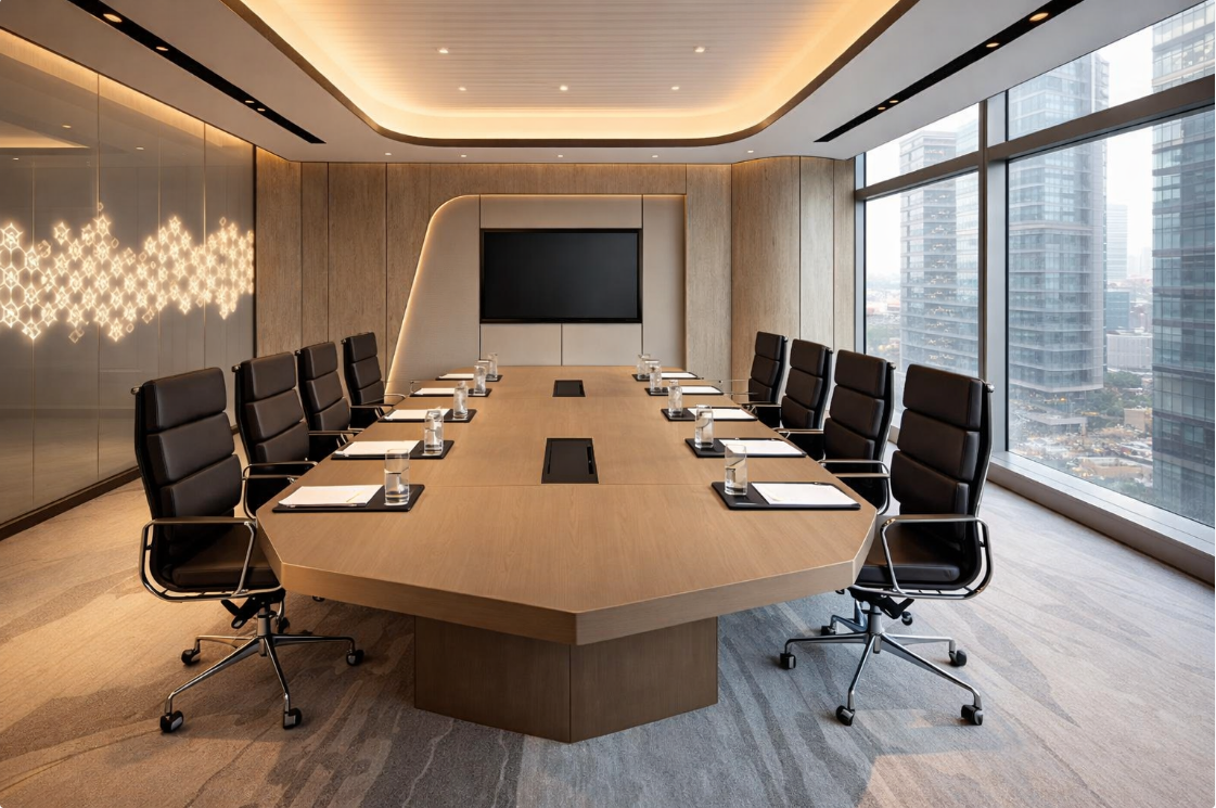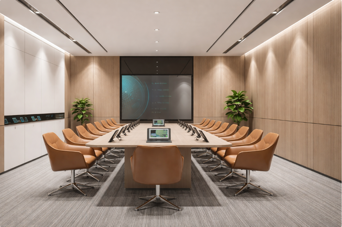 Sleek and Modern Design: A contemporary meeting room equipped with high-tech devices and a minimalist design. The MDF acoustic panels optimize sound clarity, ensuring smooth meeting processes.