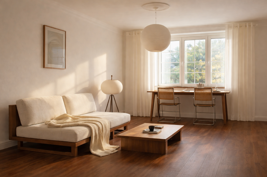 In modern living rooms, SPC flooring pairs seamlessly with stylish furniture, presenting a clean and sophisticated look. The combination of light wood tones and contemporary furniture creates a warm, inviting atmosphere, making it an ideal choice for spaces that require both beauty and functionality.