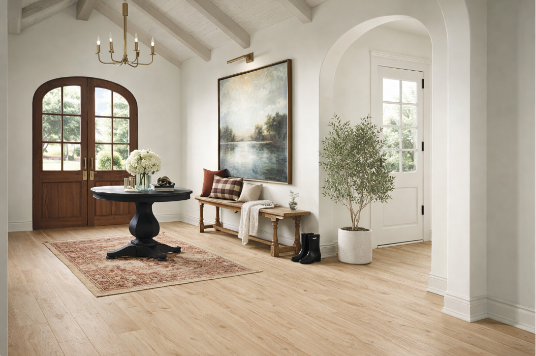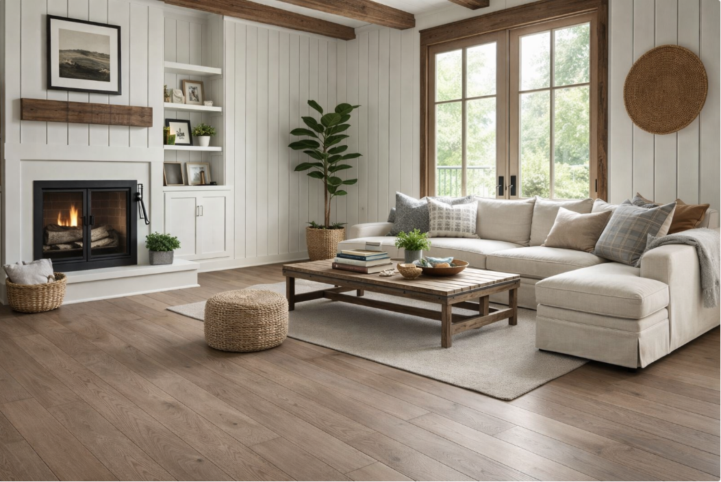 From spacious living rooms to cozy entryways, SPC flooring brings a warm and natural atmosphere to every space. The first image showcases a warm wood tone that seamlessly integrates with the soft sofa and modern, minimalist kitchen; the second image highlights a refined and elegant entryway, with light wood tones that complement natural decor elements; the third image depicts a cozy living room with rustic charm, where the dark wood SPC flooring enhances the warmth of the fireplace.