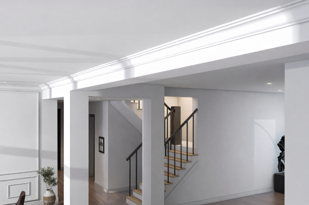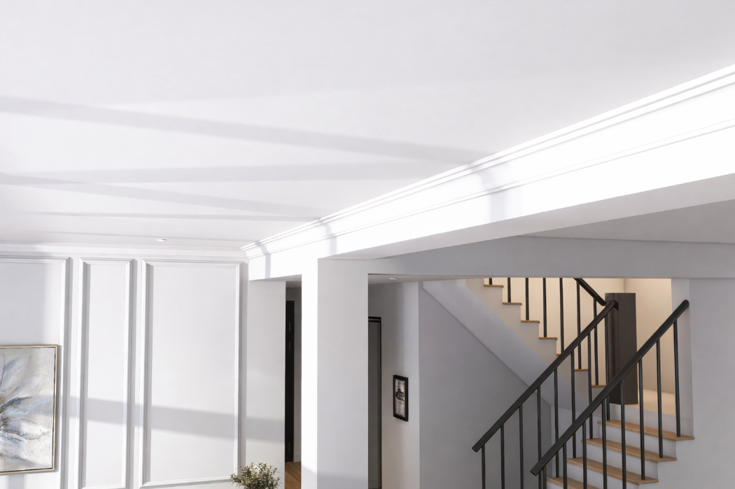 PS crown moulding reflects soft lighting, giving the space an elegant touch. Whether paired with minimalist styles or classic decor, PS crown moulding adds a distinctive charm to any room.