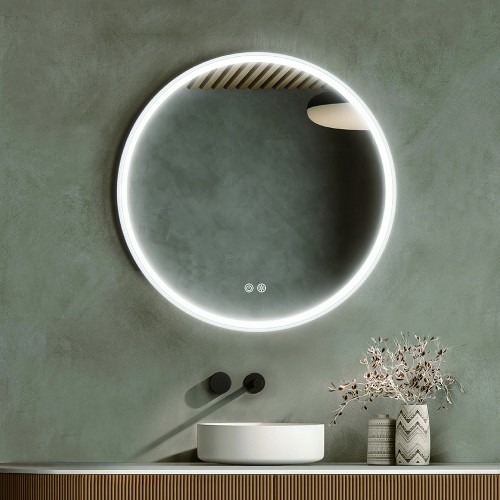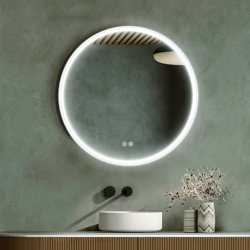 The LED mirrors by INTCO DECOR feature a copper-free mirror, aluminum frame, smart touch switch, adjustable LED color temperature and intensity, and an IP44 rating.