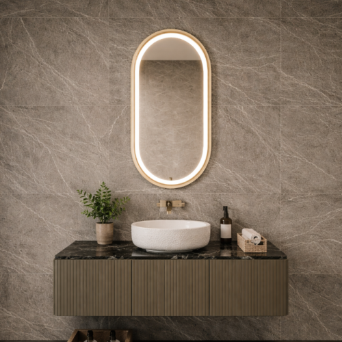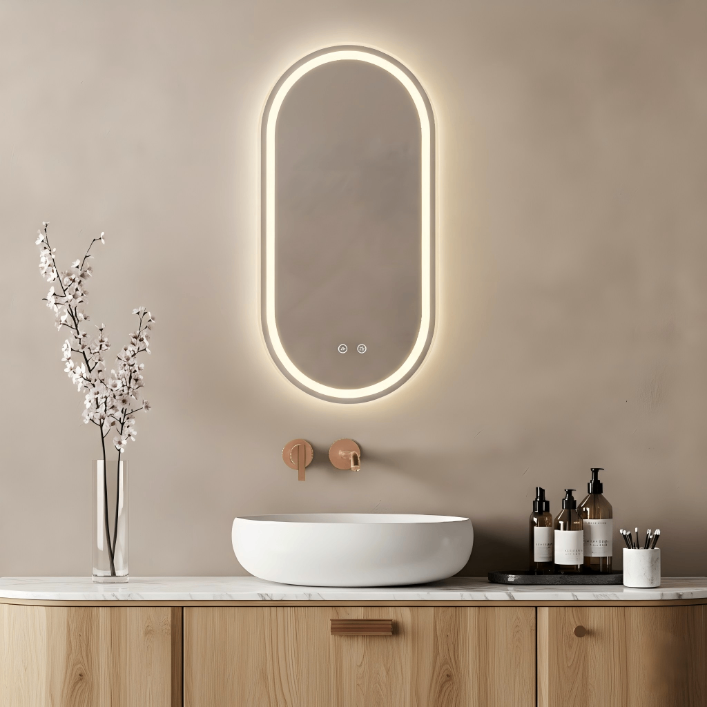 The LED mirrors by INTCO DECOR feature a copper-free mirror, aluminum frame, smart touch switch, adjustable LED color temperature and intensity, and an IP44 rating.